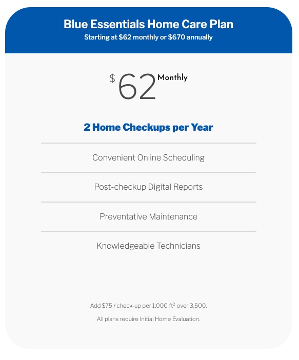 The Blue Essentials Plan is for homeowners who prefer a more proactive approach without handyman hours. The Blue Essentials Plan includes two scheduled home checkups per year. These regular visits help maintain your home’s health and catch issues before they become costly problems. With a focus on checkups only, this plan delivers peace of mind through consistent monitoring.